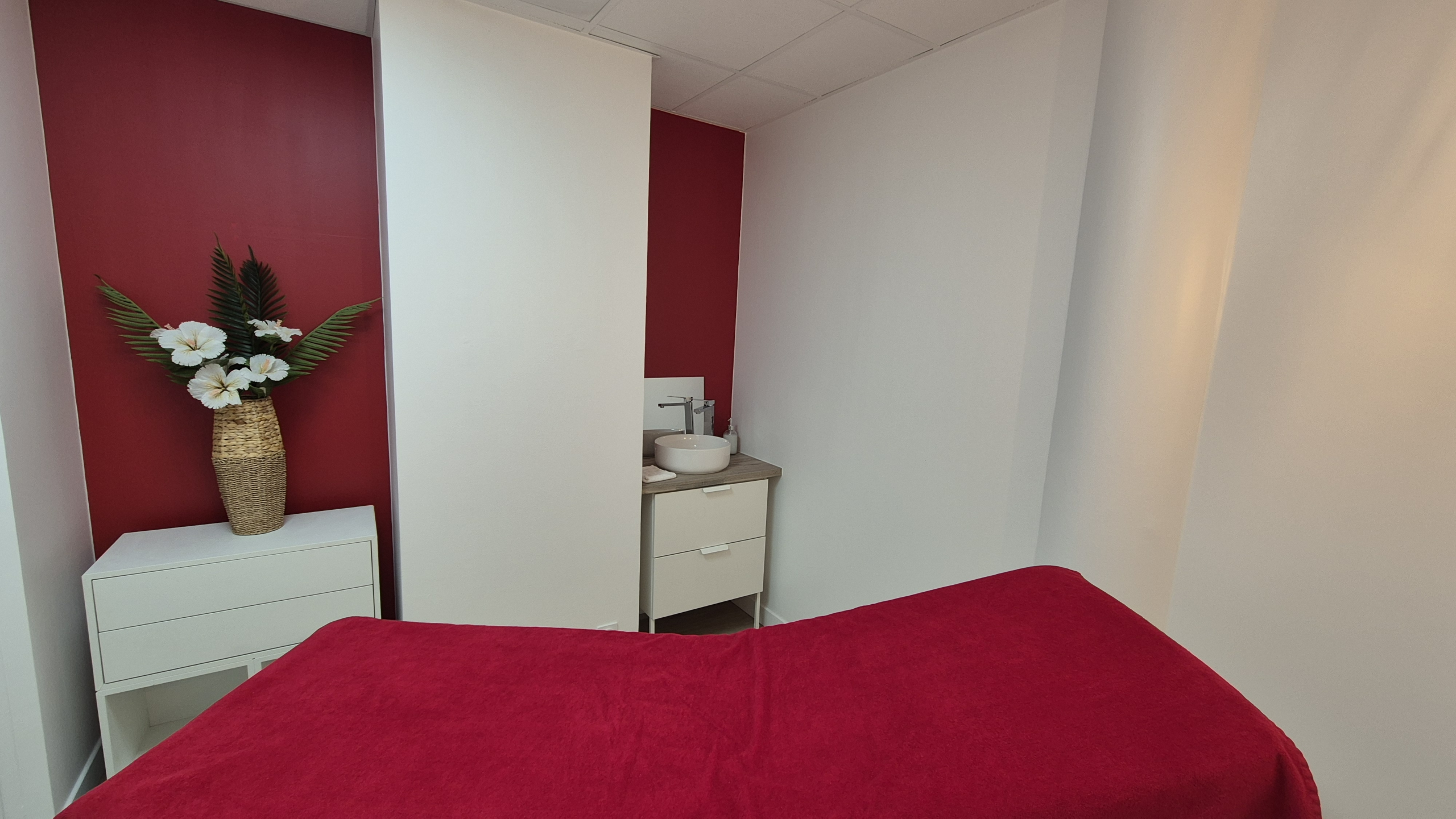A votre disposition, un lavabo et meuble 2 tiroirs , une table de soin et un marche pieds , un miroir, porte manteau et meuble d'appoint avec rangement.